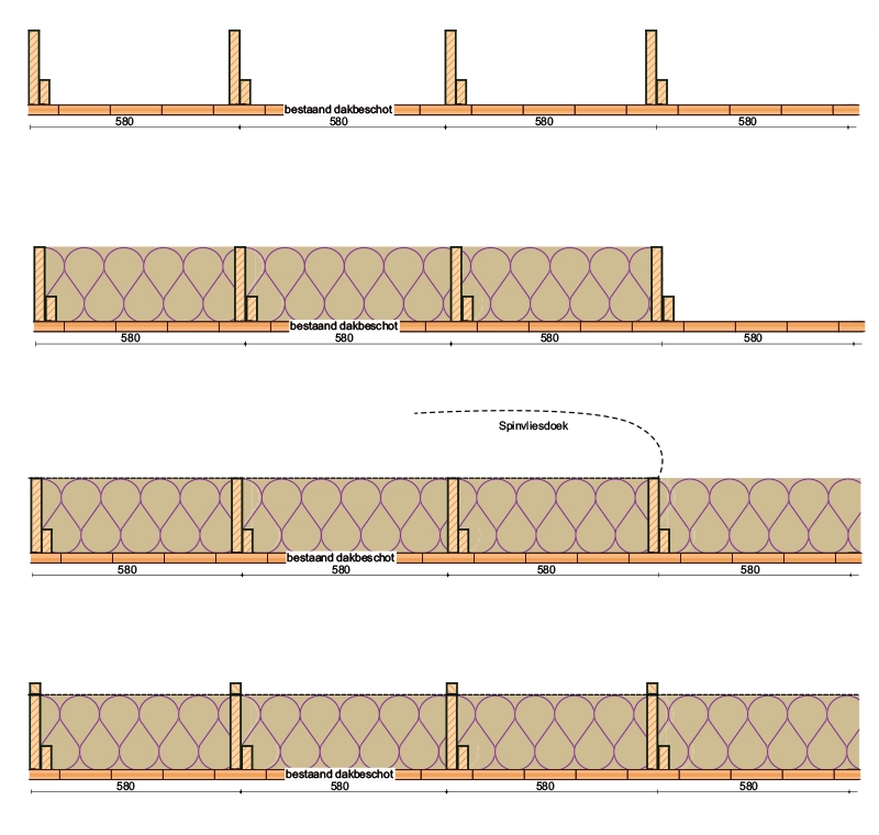 - Spinvliesdoek bevestigen over isolatie op de schroefregels