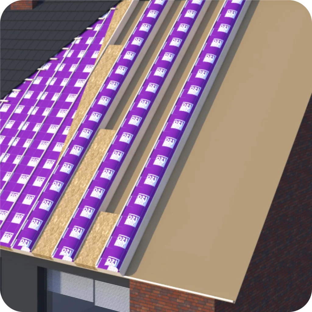 - Eenvoudige installatie: het systeem is licht van gewicht, flexibel en wordt rechtstreeks op het bestaande dakbeschot geplaatst.