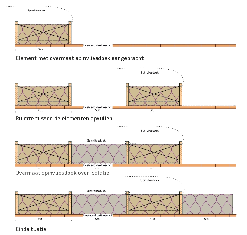 - Overmaat spinvliesdoek van de elementen omslaan over het aangebrachte isovlas tussen de elementen